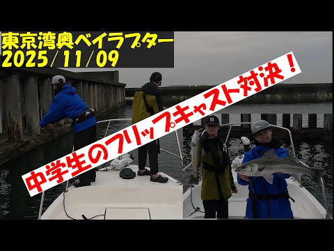 【東京湾ボートシーバス釣行記】令和7年11月9日 普段はチャリンコで湾奥のシーバスを狙う二人の中学生がフリップキャストで対決です。