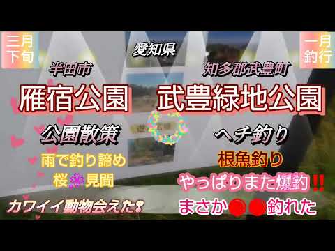 最新‼️桜🌸&釣り 愛知県 半田市 雁宿公園 公園散策 雨で釣り諦め桜🌸見聞 カワイイ動物会えた❢三月下旬 知多郡武豊町 武豊緑地公園 ヘチ釣り根魚釣り やっぱりまた爆釣❕まさか🔴🔴つれた 一月釣行